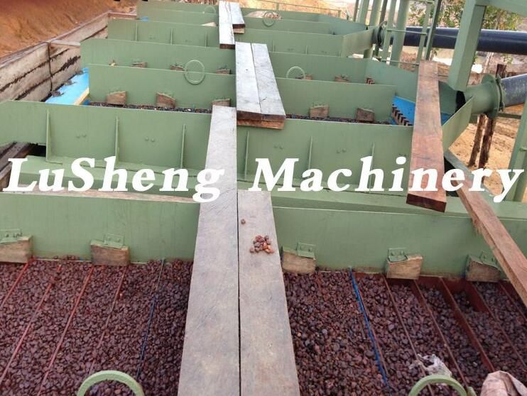 小于8mm的物料經(jīng)螺旋輸送機(jī)輸送至料倉(cāng)與細(xì)碎后的物料混合。料倉(cāng)下設(shè)置自動(dòng)給料裝置,將物料均勻給入往復(fù)式循環(huán)溜槽,往復(fù)式循環(huán)溜槽作為重選流程的設(shè)備,其作用就是將錫石和廢石分離,取得高純度的錫石,拋棄不含錫的廢石,達(dá)到選礦提純的目的。該設(shè)備自動(dòng)排礦精礦則直接進(jìn)入精礦池。尾礦自動(dòng)排棄。選鉭鈮礦設(shè)備