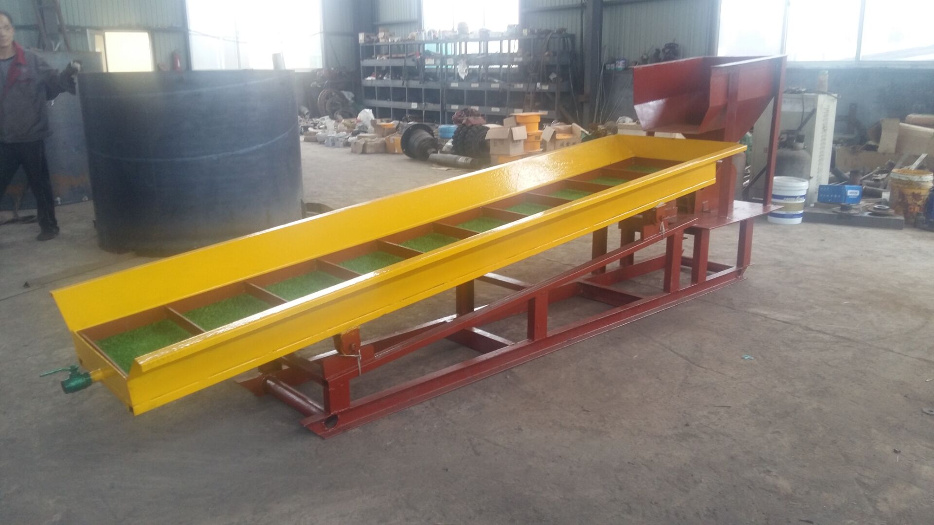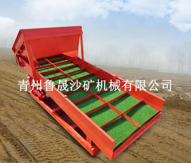 通過人工或者小型挖掘機將料上至料斗內,料斗內有噴水裝置,料斗底板為傾斜式。礦料流淌流暢、均勻。礦料進入精選槽格眼處和格邊處形成一個相對負壓的狀態,對礦料有一個“吸”的作用,金被強制吸入,進入相對平靜的格板下層內,經過蠕動的作用格板內的沙料是很疏松的,不會出現普通溜槽的板結現象。